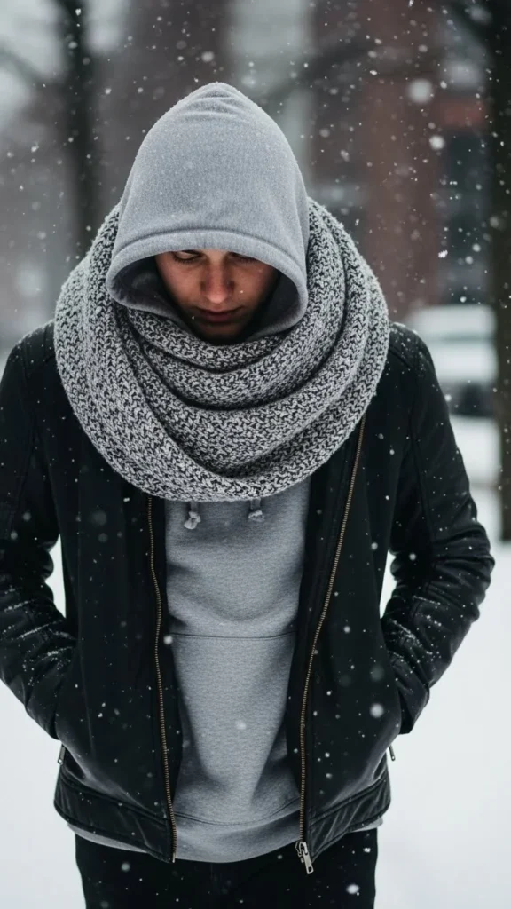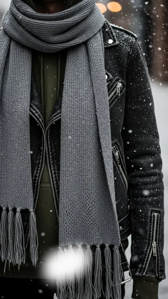 Long scarves create vertical lines. Choose a soft fabric so it drapes well. Pair with simple denim and boots. This outfit works for daily winter commutes. Scarves add warmth and calm contrast to leather.
