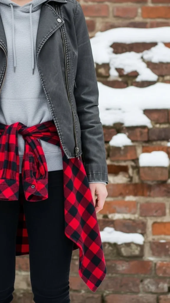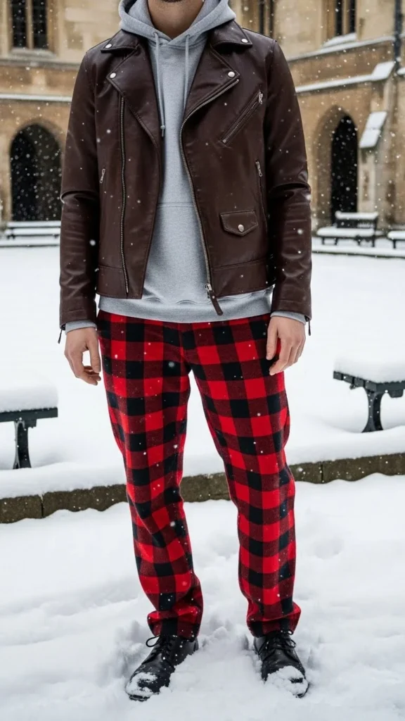 Flannel pants add warmth and softness. Pair with a fitted hoodie so the outfit stays grounded. Add boots or sneakers. This combination suits indoor-outdoor winter plans. Flannel trousers are inexpensive and comfortable. The leather layer adds necessary contrast.