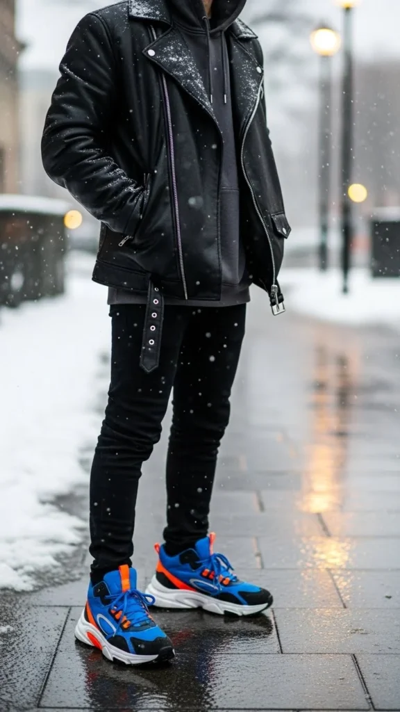 Bright sneakers add life to dark winter outfits. Choose red, blue, or neon accents. Keep the hoodie and jacket simple. Add jeans or joggers. This pairing suits casual city walks or weekend plans. Colour-pop sneakers are affordable and fun to rotate.