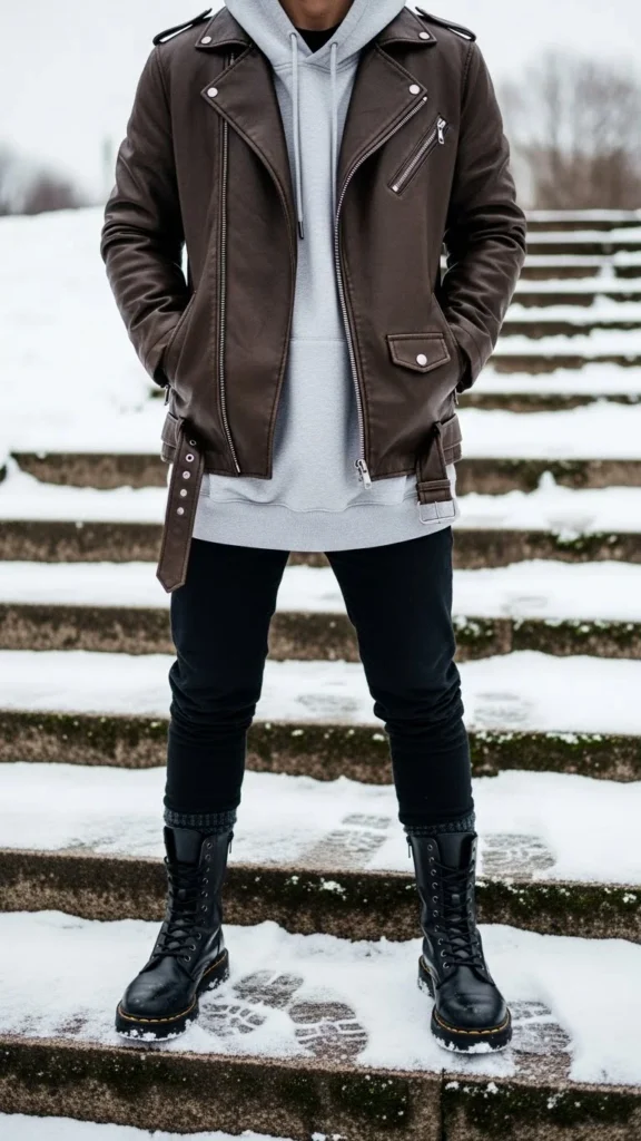 Combat boots match faux-leather’s edge. Pair with joggers or slim jeans. Add gloves for warmth. This outfit suits urban winter days or music outings. If boots feel heavy, choose a lighter sole. Combat-style options are easy to find at budget prices.