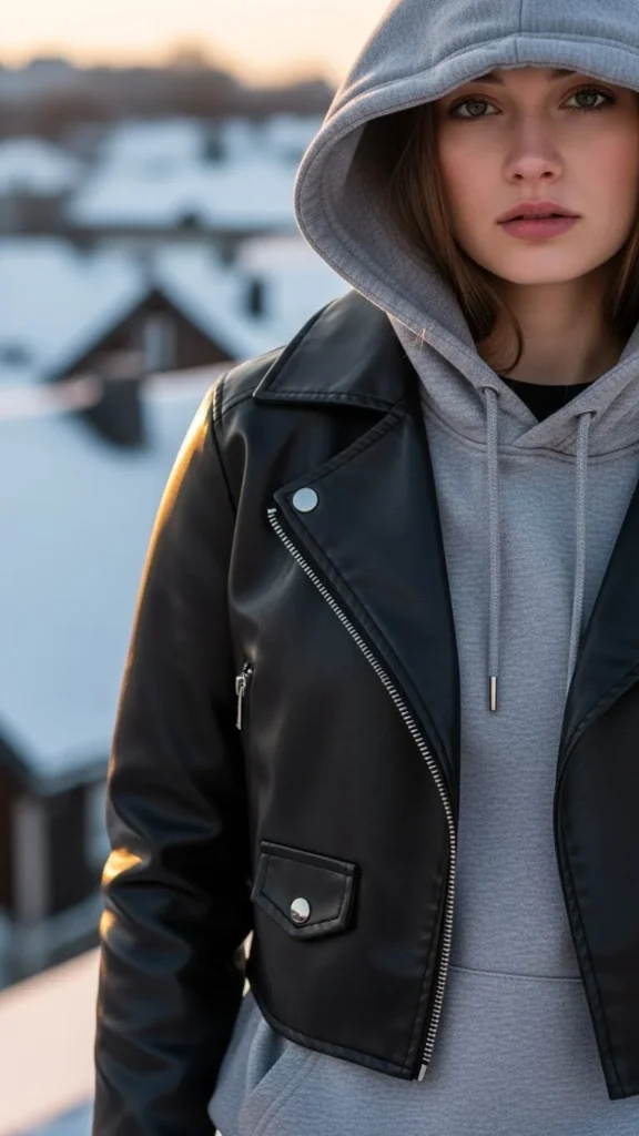 22 Cool Faux-Leather-Jacket + Hoodie Winter Looks That Mix Edge & Comfy