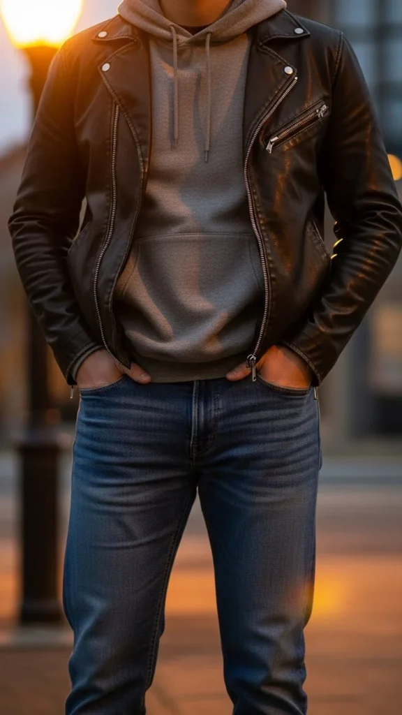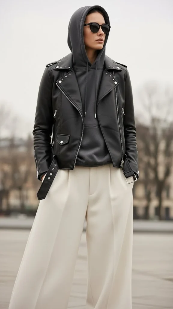 Wide-leg pants soften the biker jacket’s edge. Choose a fitted hoodie to balance volume. Add heeled boots or platforms to lift the pants. This look suits evening outings or leisurely weekends. If the wind feels strong, use a heavier pant fabric. The contrast of hard leather lines and fluid fabric feels expressive.