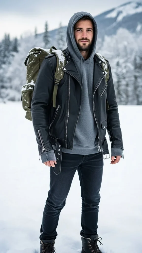 Monochrome black makes this combo feel sharp. The hoodie adds warmth without hiding the jacket’s lines. Pair with jeans or joggers. Add black boots or sneakers. If the jacket feels stiff, choose a hoodie with a thinner fabric. This outfit works for everyday winter errands or relaxed evenings. You can find affordable faux-leather options easily. Add a slim backpack or crossbody bag to keep the look clean. Gloves in a matching shade help complete the mood.