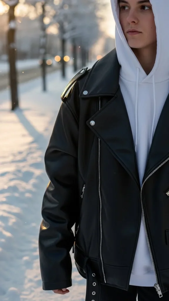 A white hoodie brightens darker outerwear. Oversized moto jackets add drama. Pair with straight-leg denim or slim trousers. Add boots with traction for icy walkways. If you want more shape, tuck the hoodie slightly in front. You can find white hoodies cheaply, making this an easy winter staple. The contrast of clean white and textured faux-leather feels strong and calm.