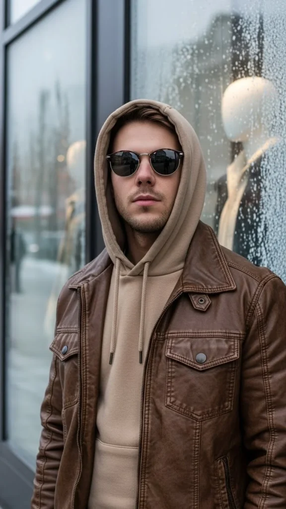4. Beige Hoodie + Brown Faux-Leather Jacket