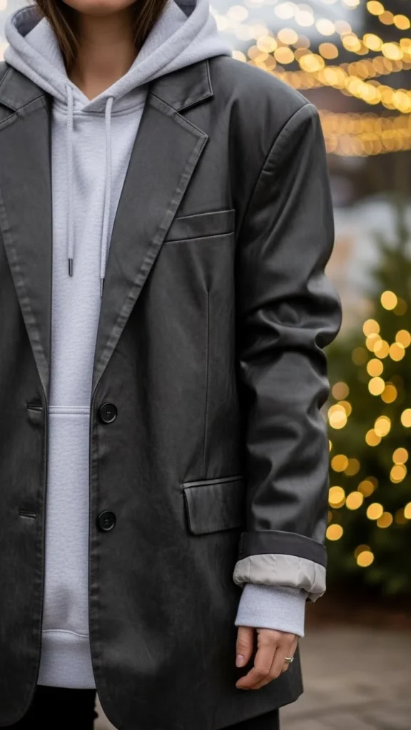 A faux-leather blazer shapes the outfit while the hoodie adds comfort. Pair with straight trousers or leggings. Add ankle boots. This look suits casual offices or winter dinners. You can thrift faux-leather blazers at low cost. The mix of structure and softness makes the outfit feel intentional without being formal.