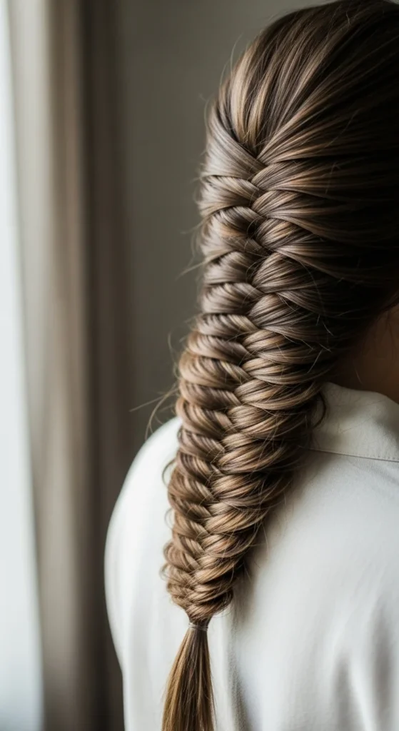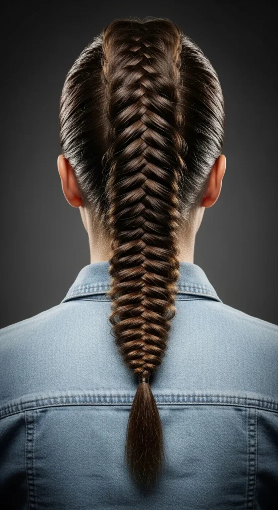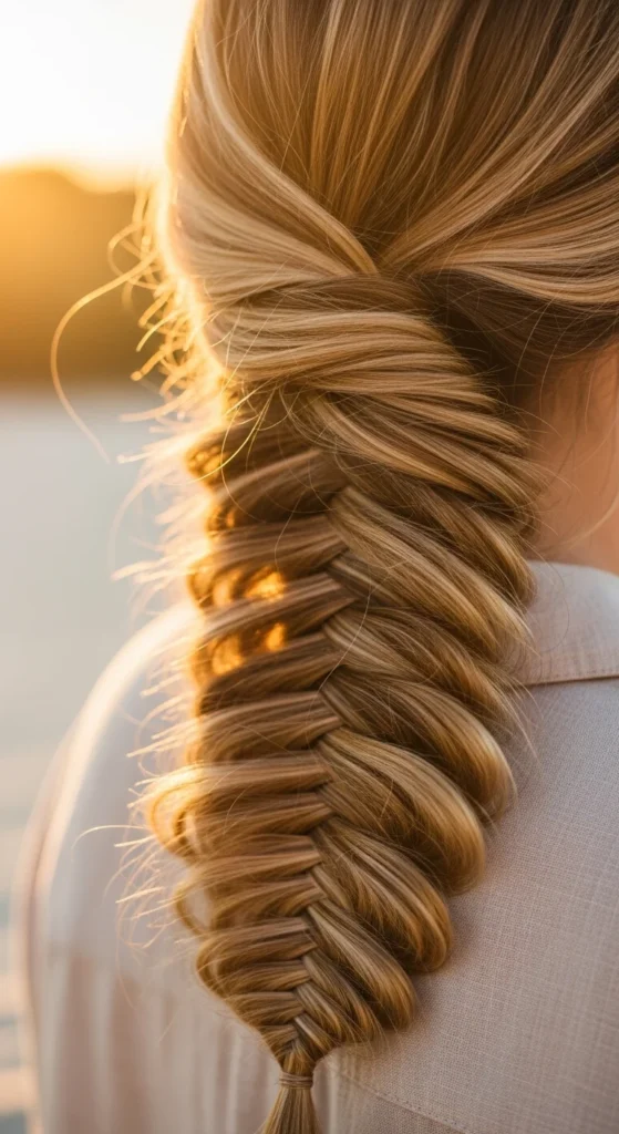 This is the fishtail everyone recognizes. It looks detailed but is beginner-friendly if you keep it simple. Sweep hair over one shoulder. Split it into two equal sections. Take a thin piece from the outside of the left section and cross it into the right. Then take a thin piece from the outside of the right section and cross it into the left. Repeat until you reach the ends.