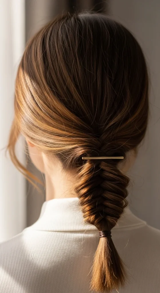 A clip makes a fishtail feel modern. Do a low ponytail fishtail. Then add a simple barrette or claw clip at the base.