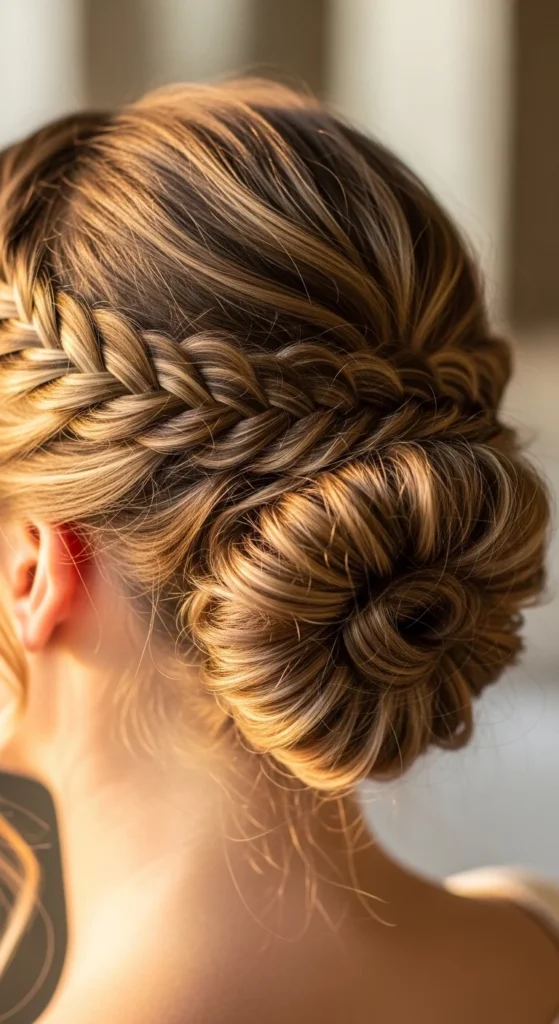 If you want extra detail, add a small clip or pin above the bun. Keep it simple so the braid texture stays the focus.