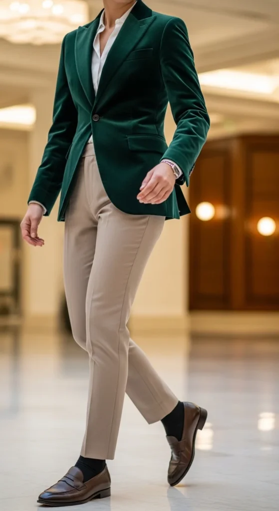 A velvet blazer paired with tailored tan trousers feels rich without being overdone. Plaid adds personality while staying professional.