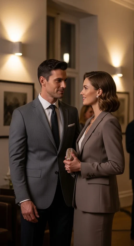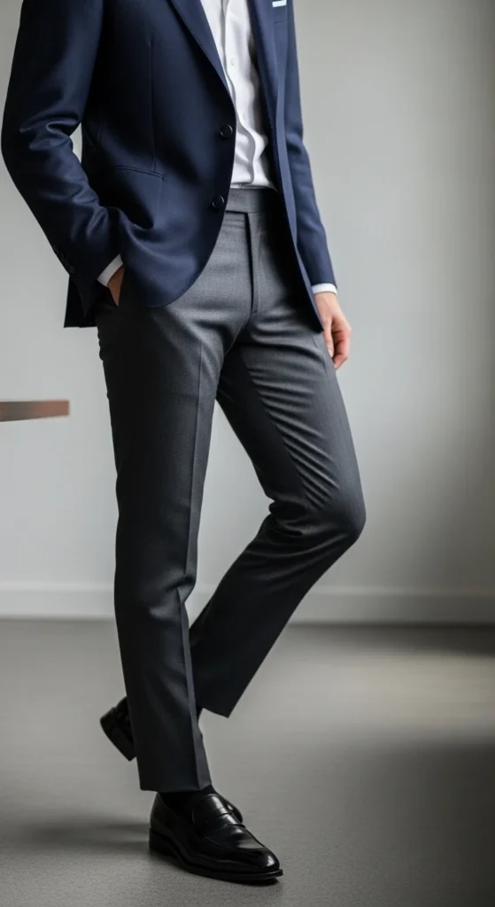 A navy blazer paired with a crisp white shirt and gray tailored trousers is a forever classic. It works for business dinners, formal meetings, and semi-formal gatherings.