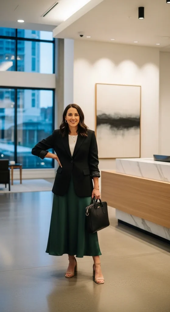 Pairing a structured blazer with a skirt creates balance between sharp and soft.
