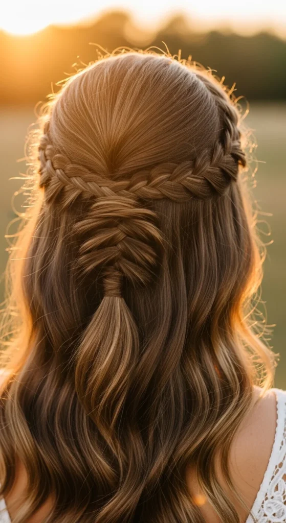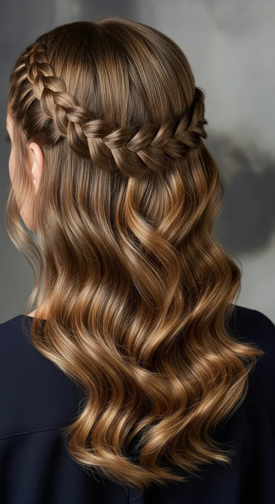 Budget tip: Heat-free waves work too. Braid the loose hair in one big braid for 30–60 minutes, undo, then do the half-up braid.
