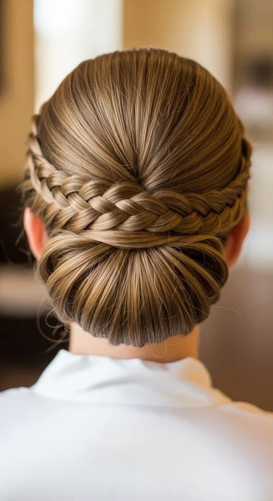 To make it softer, widen the braid slightly before forming the bun. If flyaways show up, smooth them with mousse on your hands.