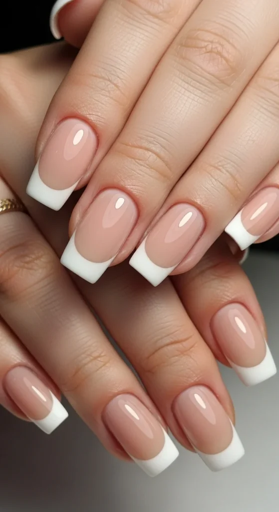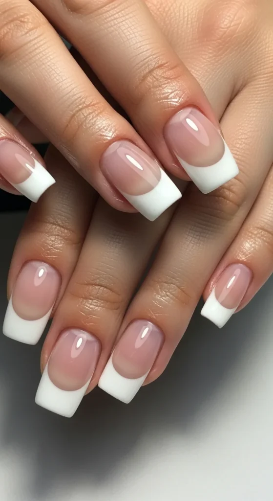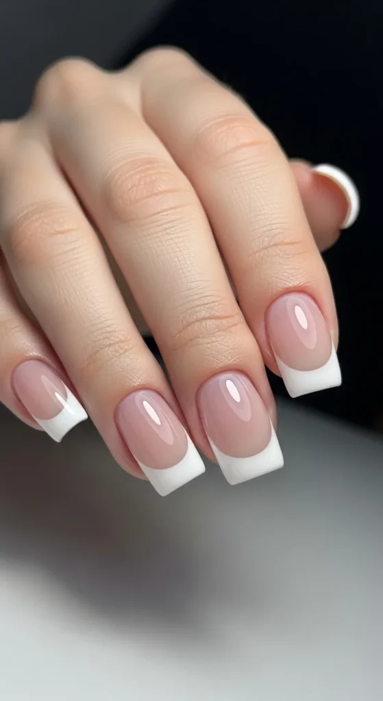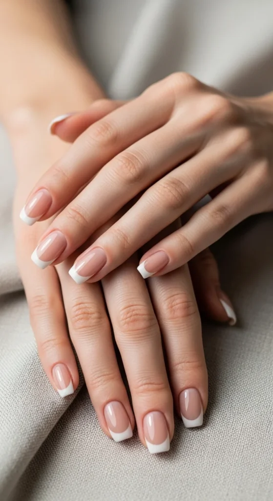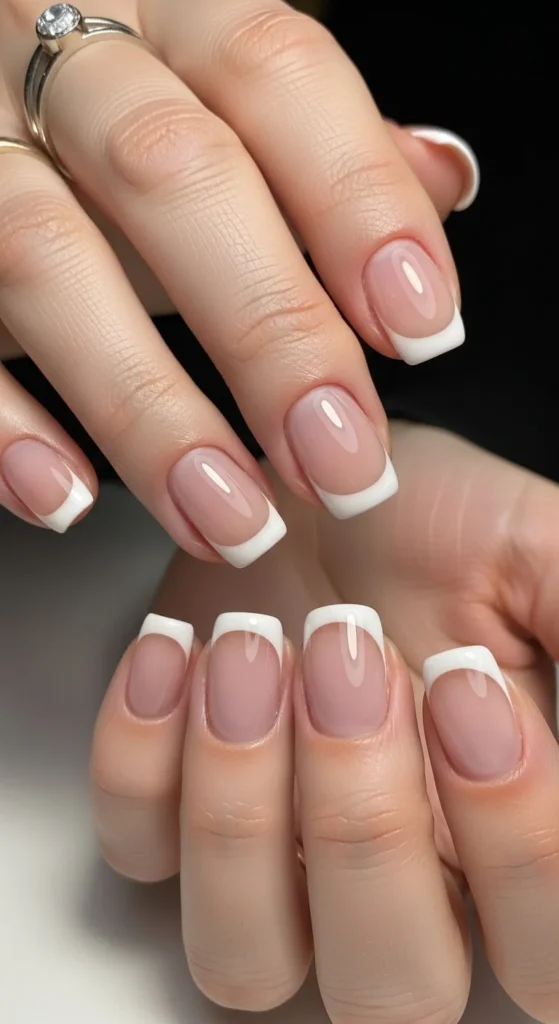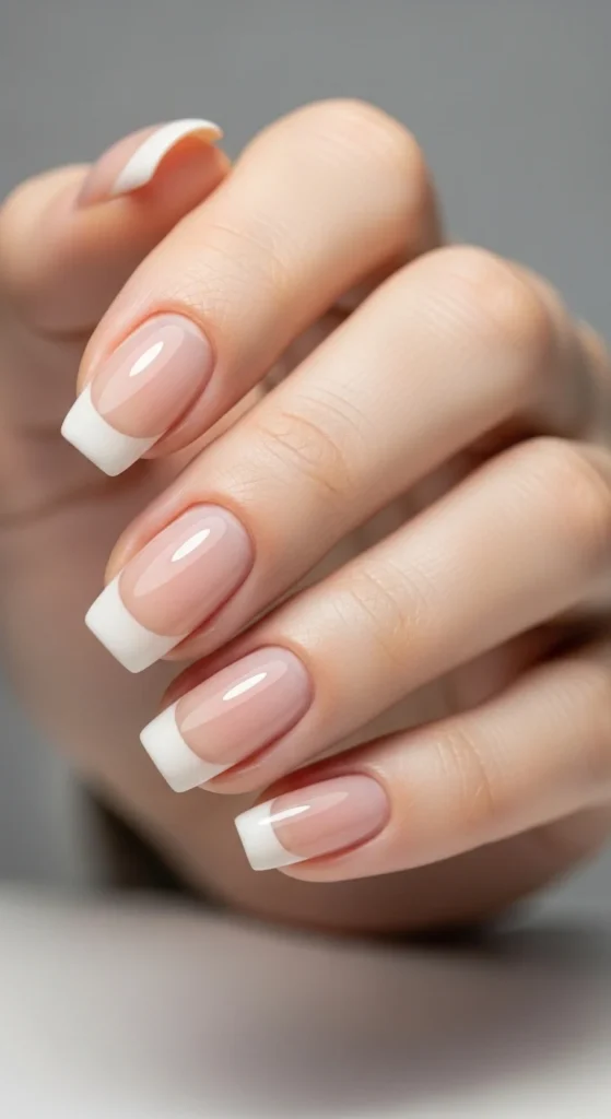 Short square nails make French tips easy to paint. Follow the straight edge. This style looks tidy and works well for busy hands. Thinning polish with a drop of clear polish helps avoid streaks.