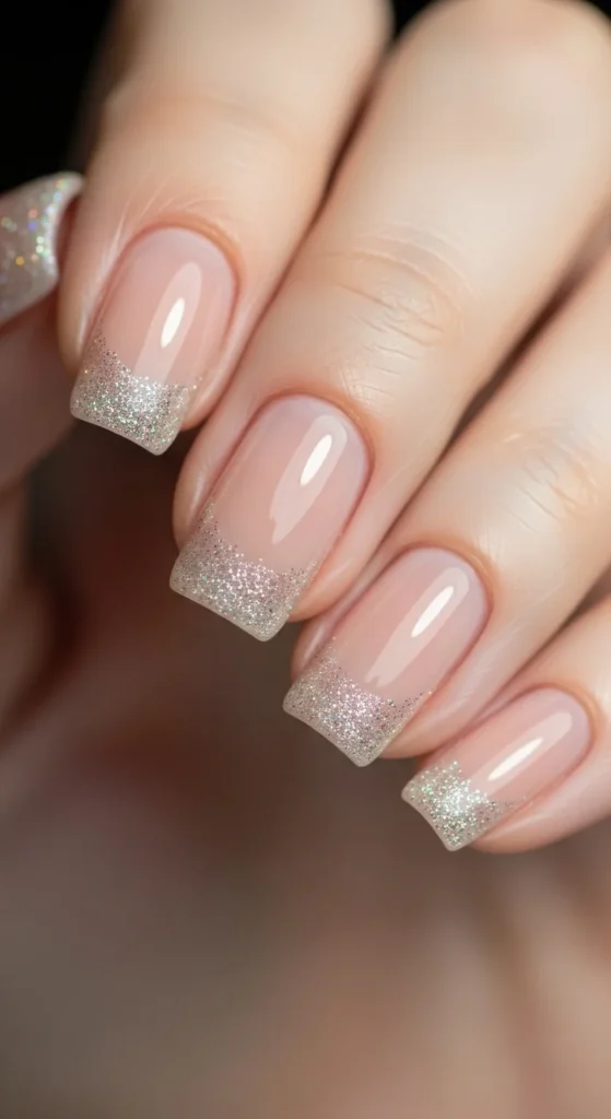 A light glitter edge adds shine without heaviness. Mix loose glitter with clear polish to save money.