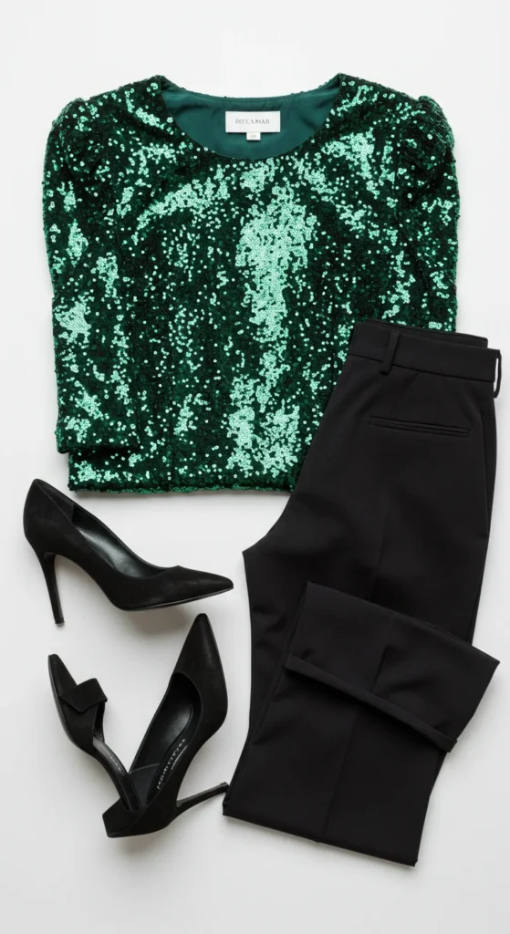 If you don’t love dresses, go for a green sequin top with black pants. Add pumps or ankle boots. If sequins feel too expensive, add iron-on sequin appliqués to a plain top. Keep accessories simple.