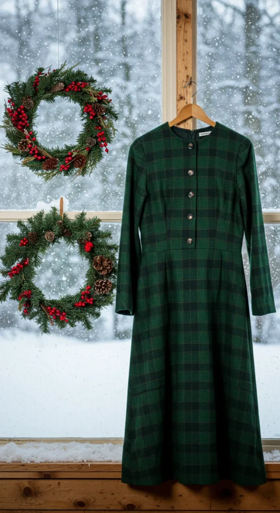 Plaid always feels festive. A green plaid dress works well for casual parties. Pair it with tights and boots. For a DIY look, belt an oversized plaid shirt and wear it as a dress. Add red accessories for a true Christmas vibe.