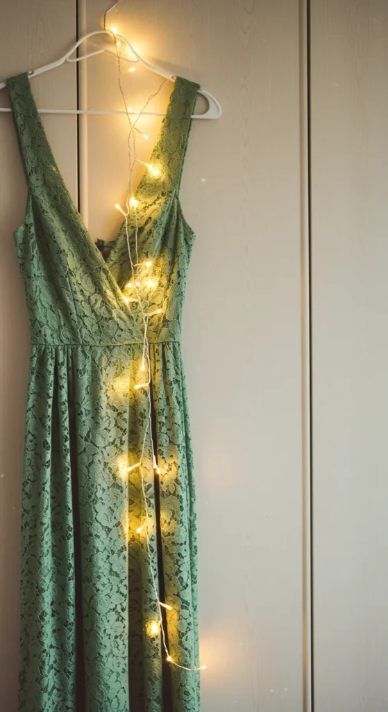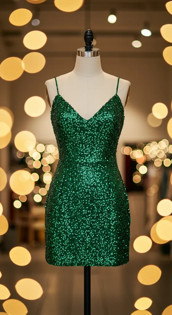 Sequins always bring the party vibe. A green sequin mini dress is a showstopper on its own, so keep accessories simple. If you’re saving money, look for sequin tops or skirts instead of full dresses. Another DIY option is adding sequin patches to an old dress for sparkle.