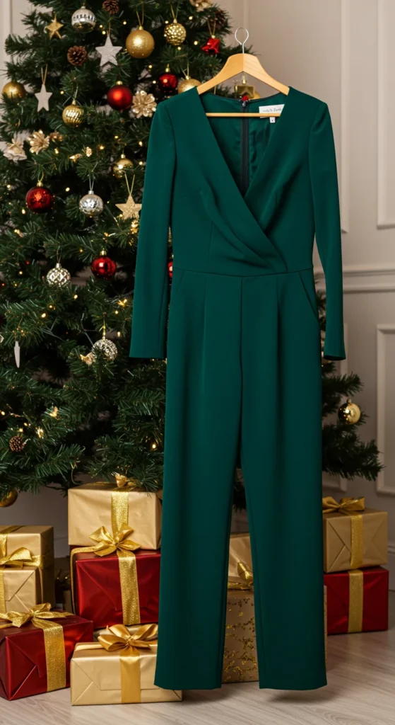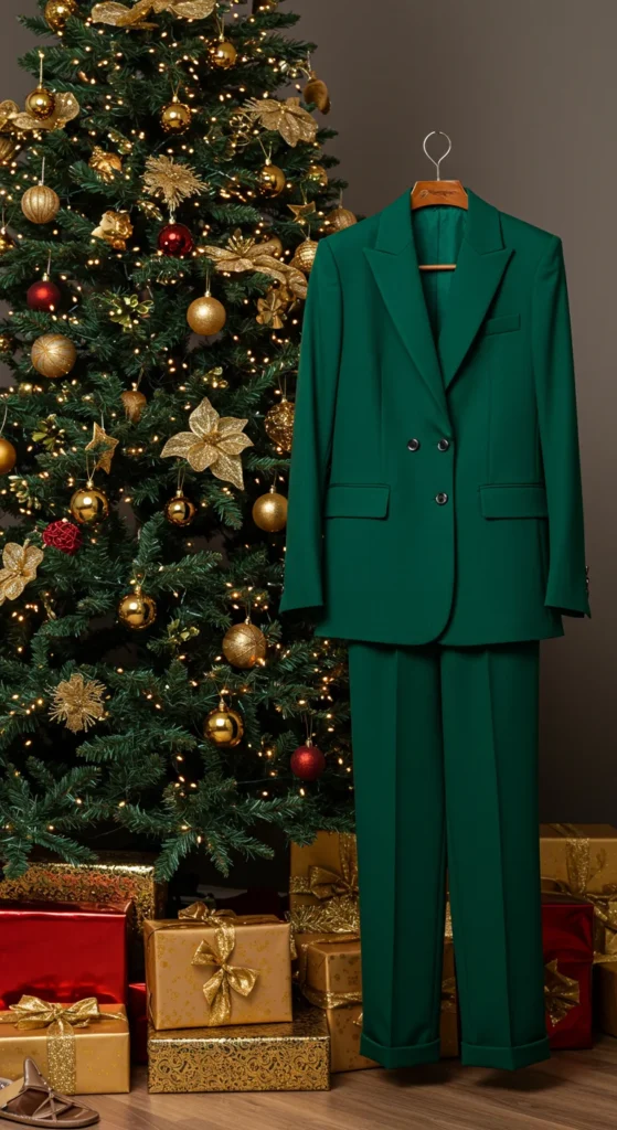 [Image Prompt: A green tailored blazer and pants suit displayed neatly beside a decorated Christmas tree.]