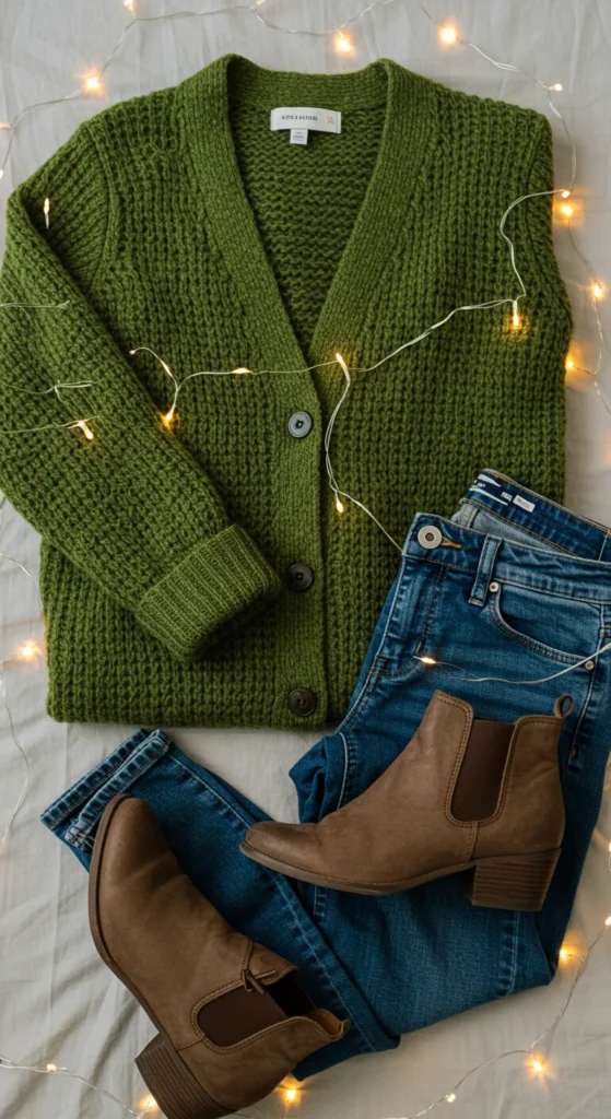 For casual holiday looks, a green cardigan with jeans is simple and comfortable. Add boots or sneakers. Thrift a plain green cardigan and sew on holiday-themed buttons for a DIY update.