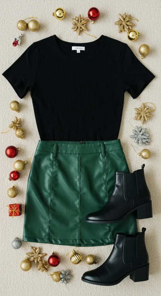 A faux leather skirt in green feels edgy. Style it with a turtleneck or fitted sweater. If you’re on a budget, look for faux leather skirts at secondhand shops. Add holiday earrings for extra cheer.