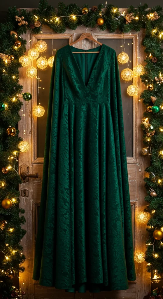 A cape dress in green feels dramatic and festive. If buying one isn’t an option, drape a green shawl or cape over a simple dress. Pair with sleek heels and sparkly jewelry.