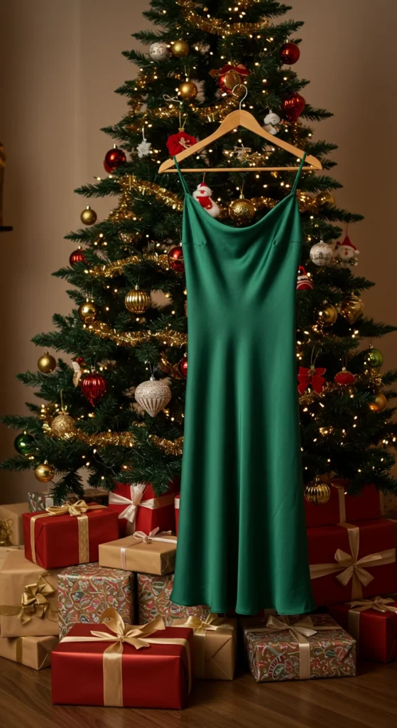 A green slip dress works for both fancy dinners and casual gatherings. Throw on a cardigan or faux fur wrap for warmth. For a more affordable version, layer a black turtleneck underneath for a chic twist. Add statement earrings and strappy sandals, or go cozy with boots and tights.