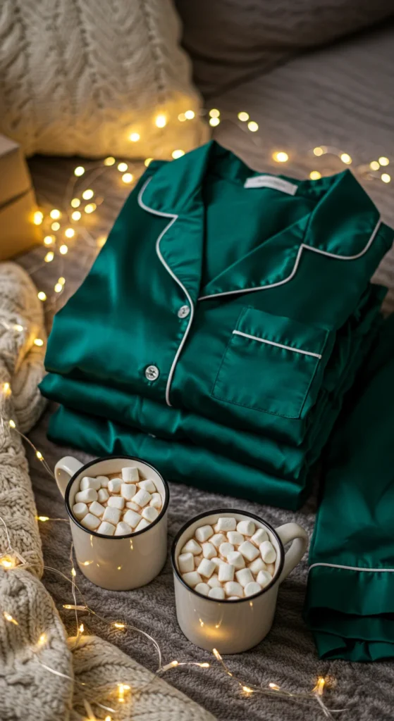 For Christmas morning, a green pajama set feels both festive and comfy. Affordable sets are easy to find, but you can also mix a green tee with plaid pajama pants. Add fluffy slippers and fuzzy socks.