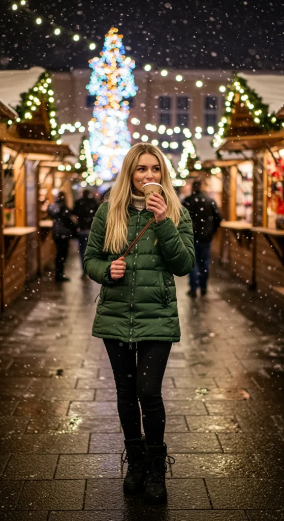 Stay cozy in a green puffer jacket styled with leggings or jeans. Affordable versions are common in thrift shops. Add a knit scarf and beanie for extra warmth.