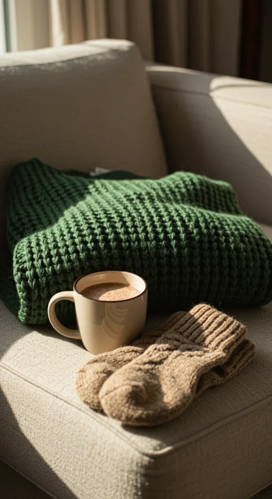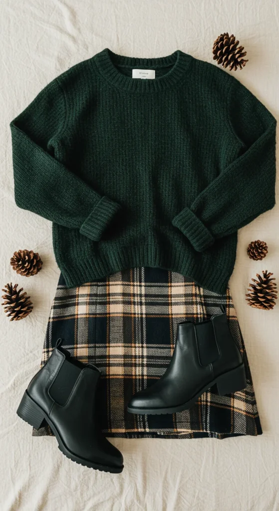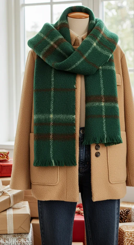 If you’re not into full-on green, add a plaid scarf over neutrals. It instantly feels holiday-ready. Thrift stores usually have plenty of plaid options. Pair with jeans, boots, and a warm coat.