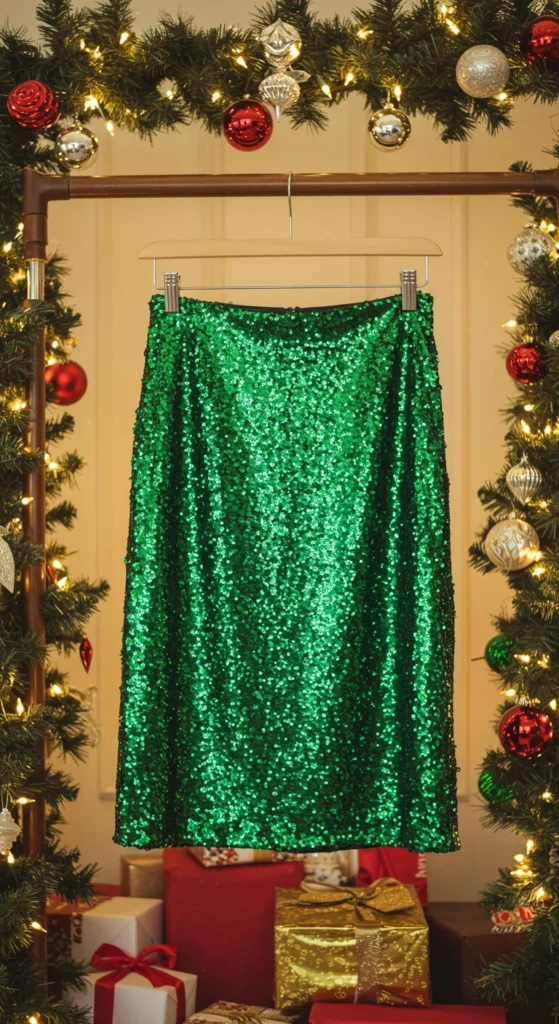 A green sequin skirt works with simple tops like turtlenecks. For an affordable option, try DIY by adding sequin fabric over a plain skirt. Style with heels or flats depending on the event.