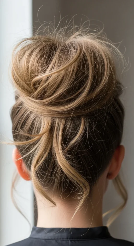 Start by brushing hair upward toward the crown. A smooth base creates the neat appearance that defines this style.