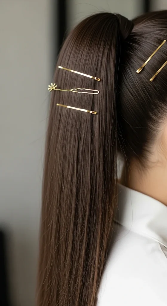 Pearl pins, metallic clips, or minimalist barrettes work well.