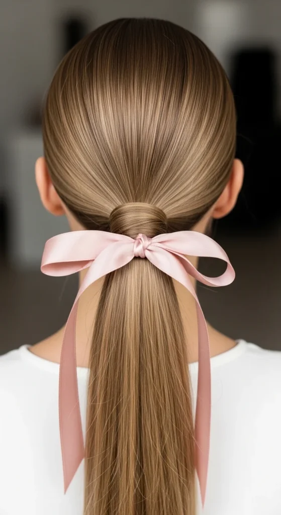 Adding a ribbon gives the ponytail a soft and feminine finish.