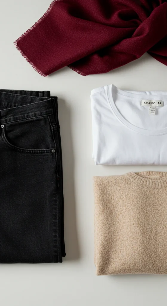 Example: Pairing a white tee and jeans with a bold scarf feels completely different than pairing them with a sleek blazer.