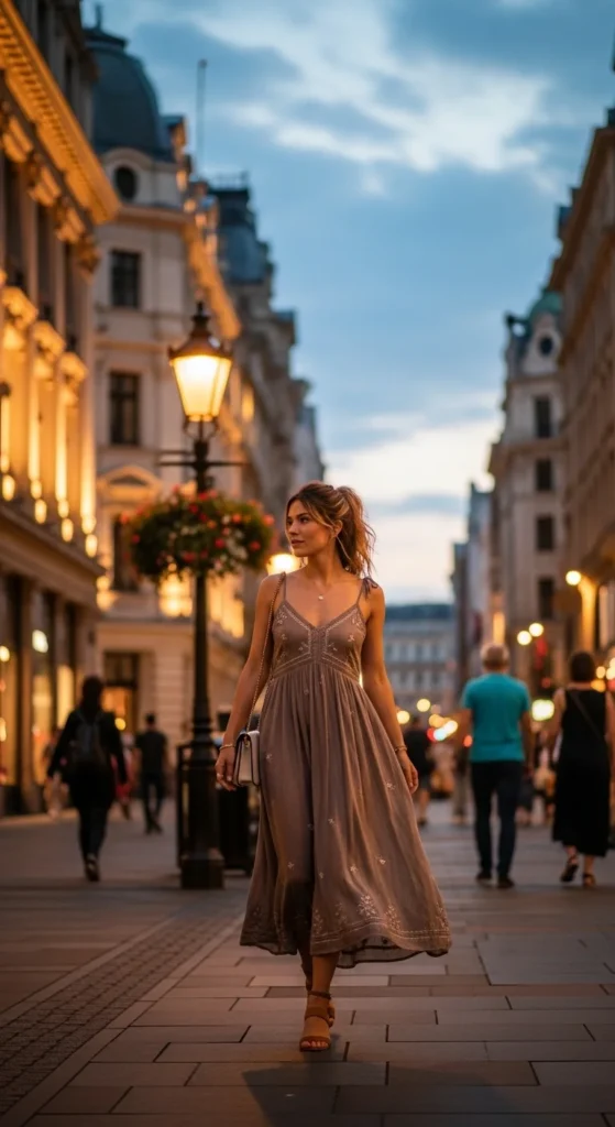 Flowy fabrics don’t just keep you comfortable—they create natural movement that looks amazing in evening light. A loose midi dress, wide-leg trousers, or a softly structured skirt instantly feels night-appropriate without being heavy.