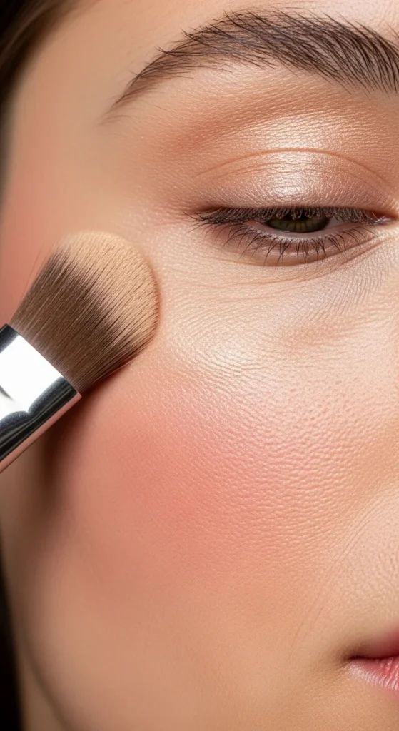 Apply highlighter to the tops of the cheekbones, just above blush, blending upward toward the temples. This instantly lifts the face.