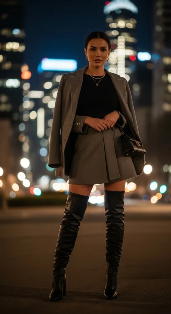 Layers help boots feel night-out appropriate instead of daytime casual. A good layer adds polish and structure.