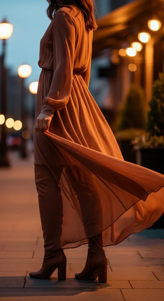 The contrast between boots and fabric is important. Since boots are structured, pairing them with the right textures keeps the outfit balanced.