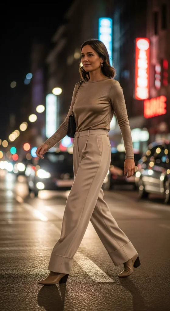 Neutrals look best when the silhouette feels purposeful. Clean lines instantly make an outfit feel elevated and night-ready.