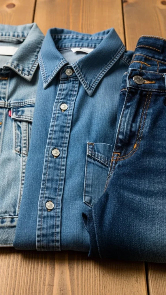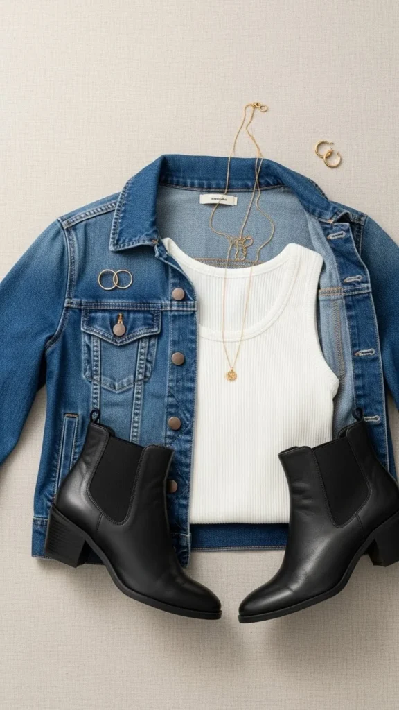 Neutral tones like white, cream, tan, or black complement denim beautifully.