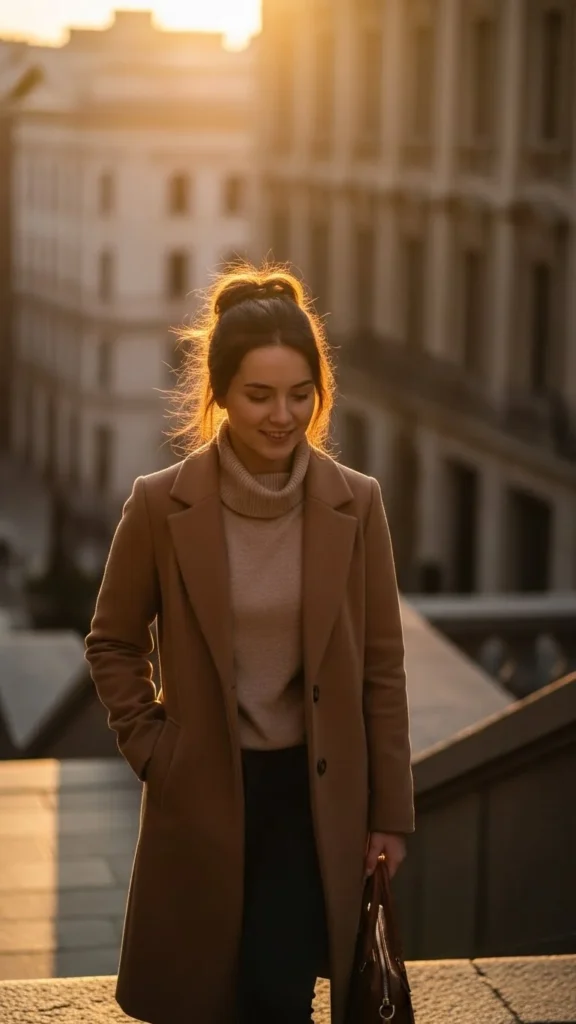 - Turtleneck + wool coat + trousers