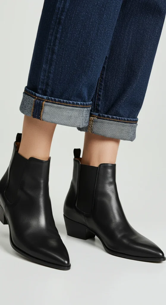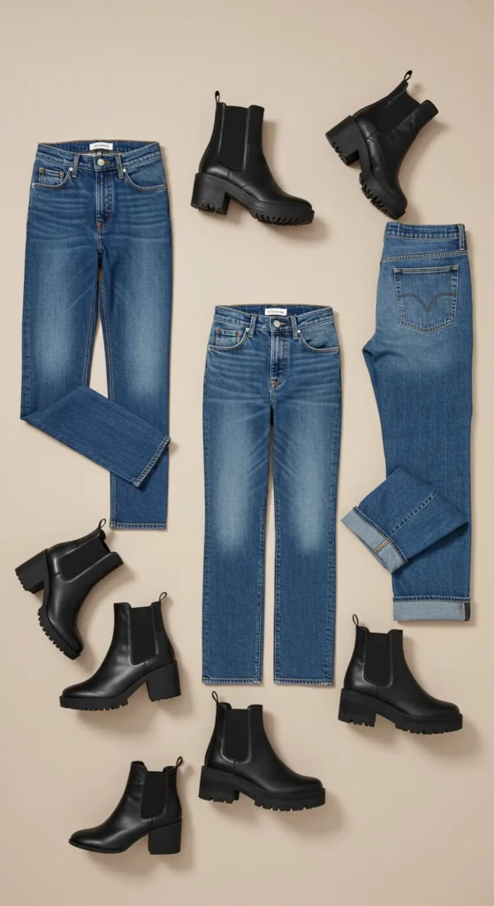 - Straight-leg jeans: Pair with Chelsea boots or ankle boots, leaving a slight gap between hem and boot.