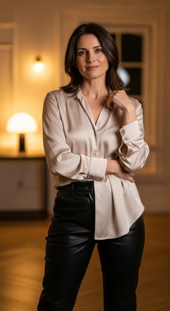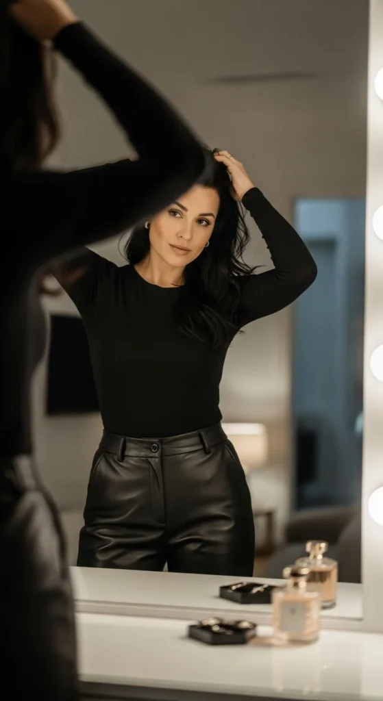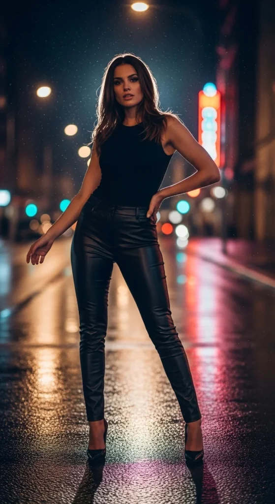 This keeps the outfit sleek and makes styling faster. You don’t need bold colors to make leather pants feel impactful.
