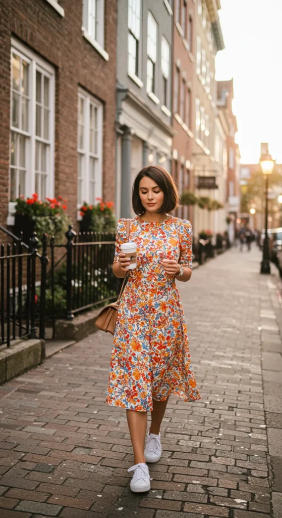 • Floral dress + denim jacket + white sneakers = classic casual chic.