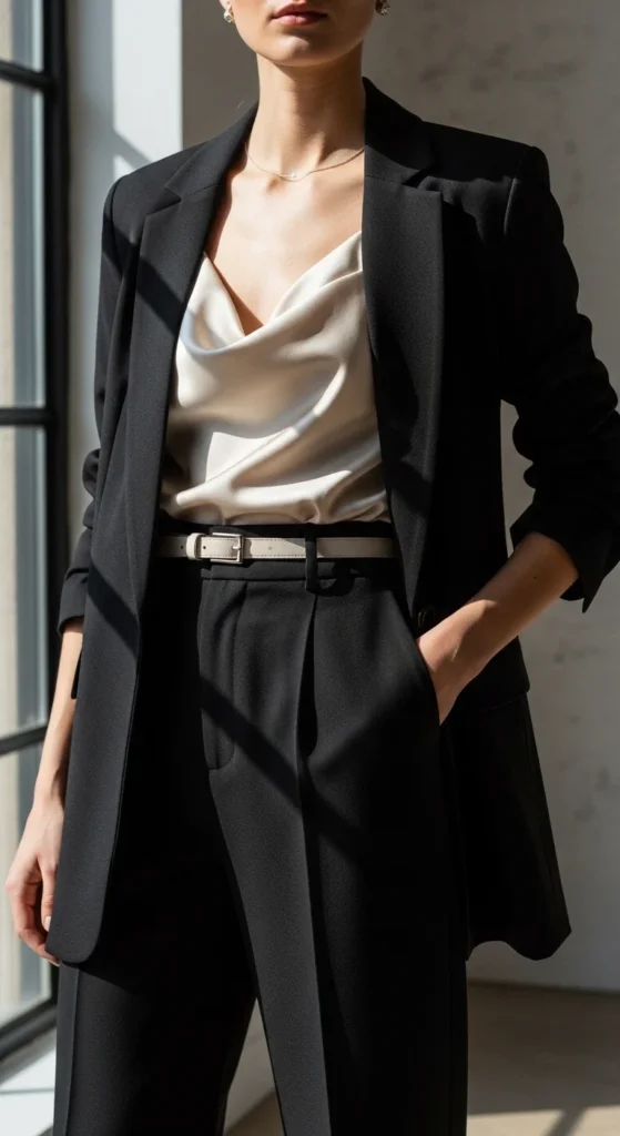 If you’re wearing volume on the bottom (wide-leg pants or full skirt), keep the top layers more streamlined. If the blazer is oversized, make the base layer fitted and keep accessories minimal.