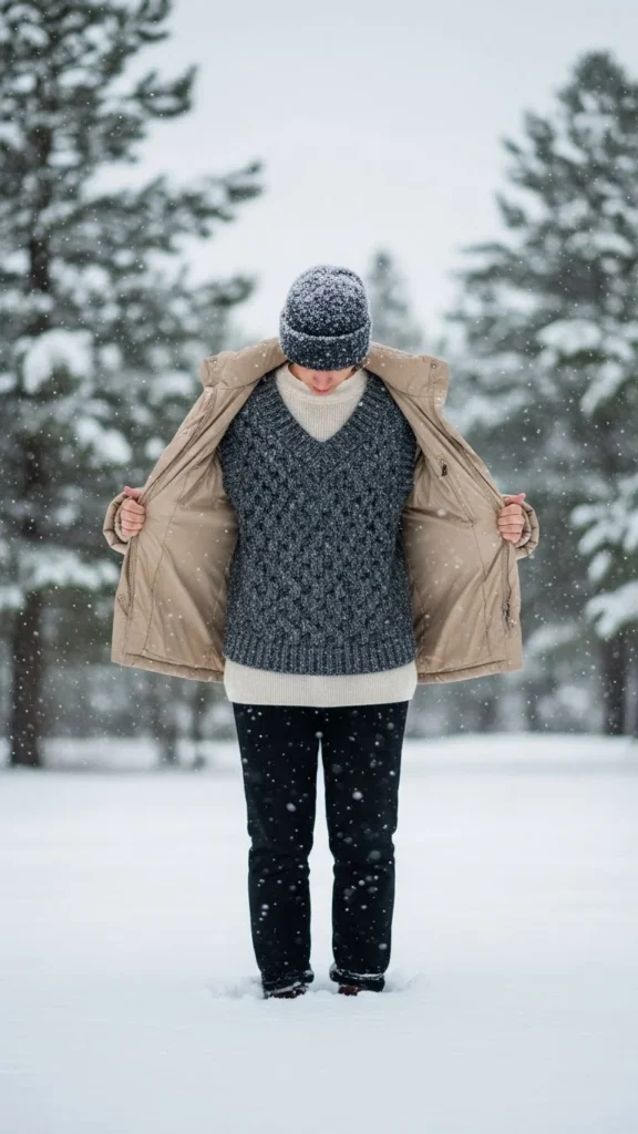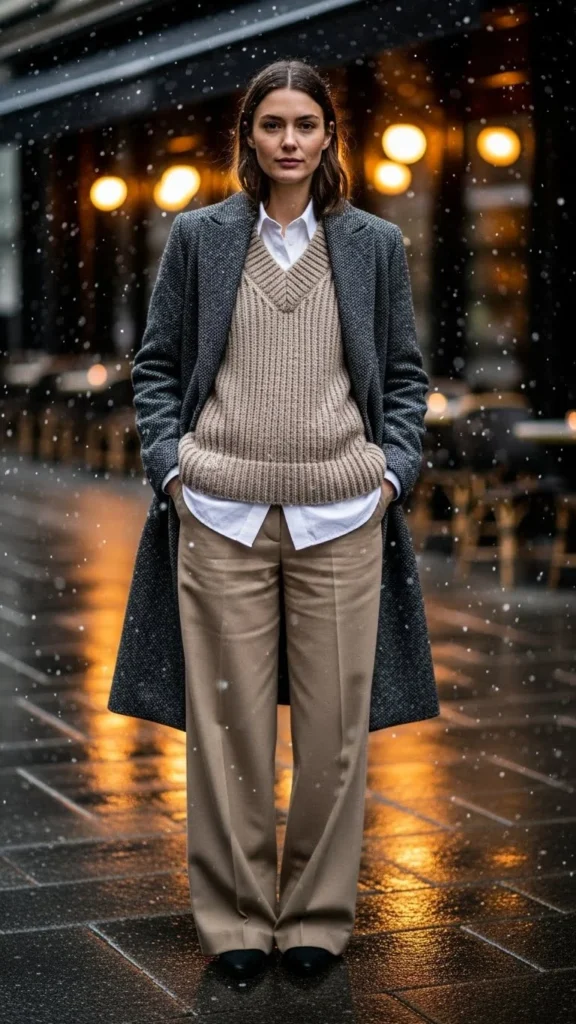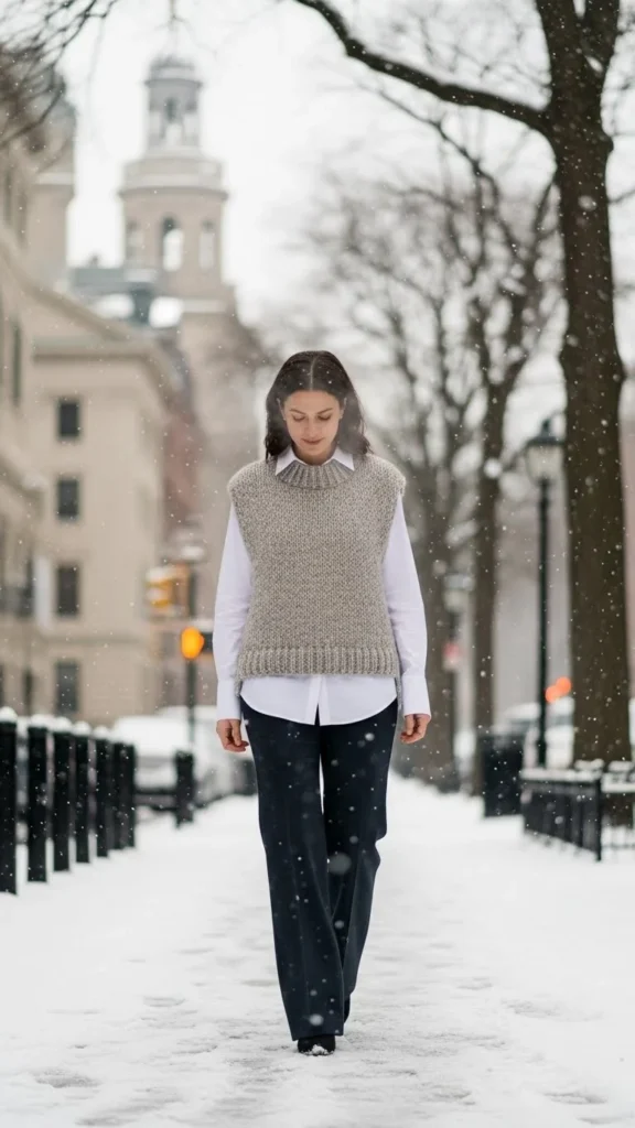 A large coat softens the sharper lines of a sweater vest. Choose a fitted top underneath so the layers don’t overwhelm. Add jeans or trousers. Boots finish the look. This pairing works well for outdoor winter plans. The vest adds warmth to the core, which helps on cold days. Affordable oversized coats from thrift stores also work well.