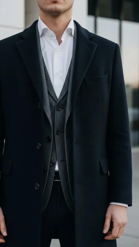 10. Sweater Vest With a Buttoned-Up Shirt and Tailored Coat