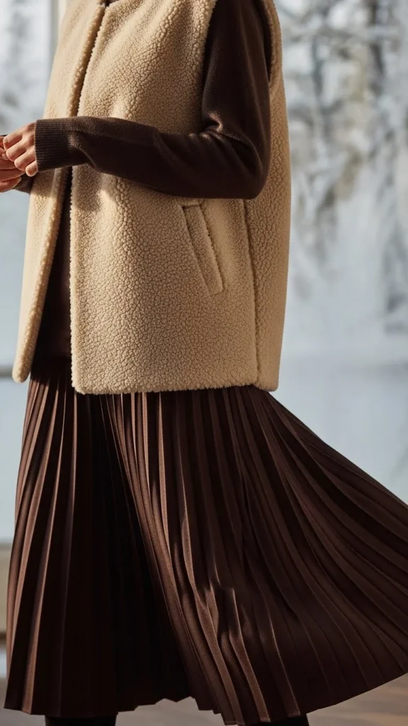 Pleated skirts add movement. Pair them with a fitted top and vest. Add boots for warmth. Choose a skirt in a solid tone for easy styling. This look suits dinners, weekend outings, or indoor events. If cold, wear thermal tights. Pleated skirts can be found at budget stores or thrift shops.